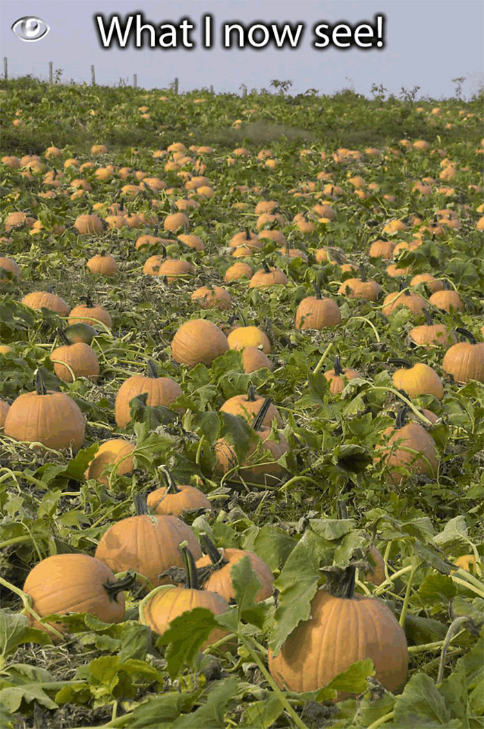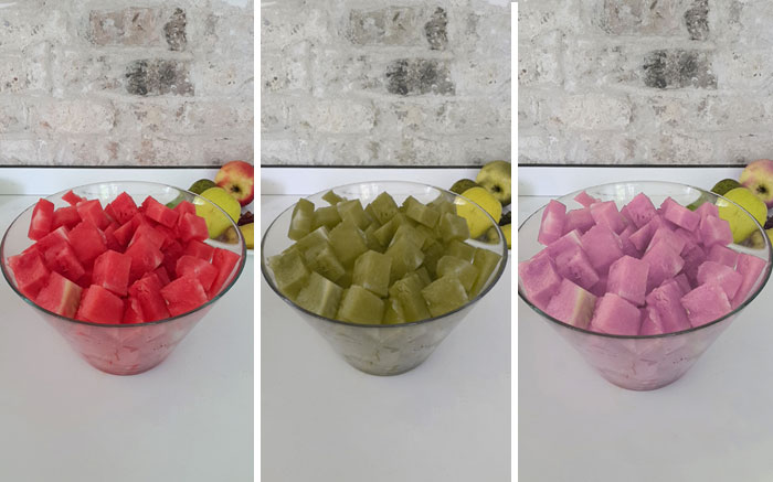 The first photo shows colors perceived by the regular vision, the second one how colors are seen by a colorblind person and the third one shows how the app helps them