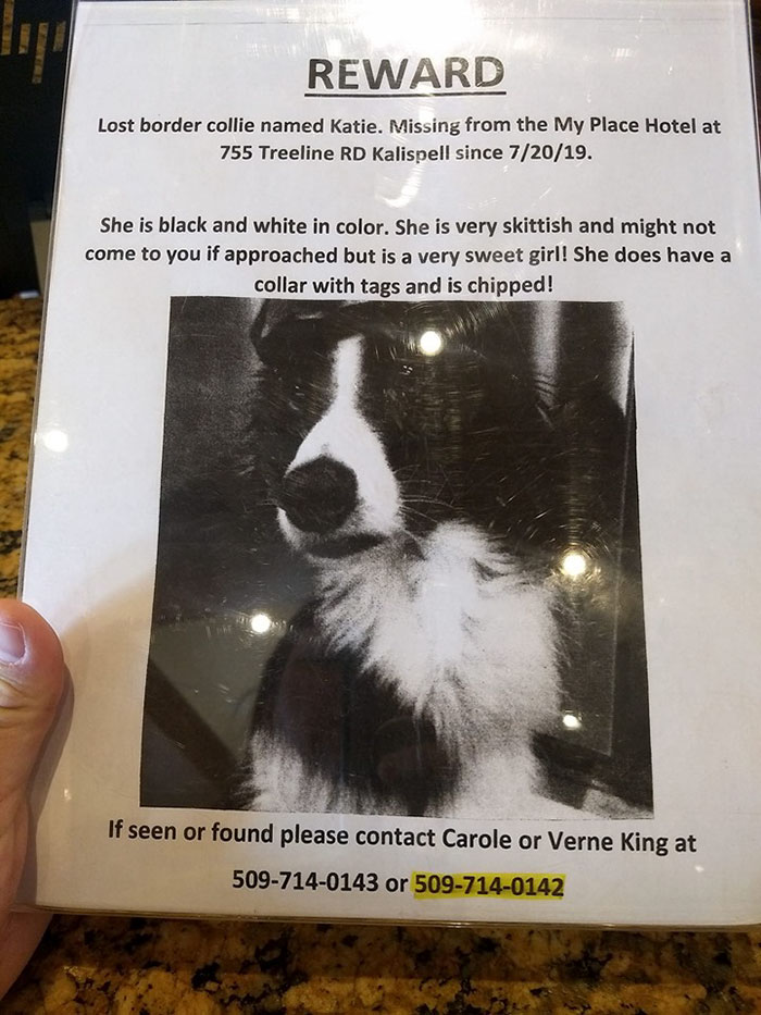 今年7月,凱蒂與主人卡羅爾和凡爾納·金前往蒙大拿州旅行時(shí),從一家旅館的房間里逃了出來。雖然她是一只社交和友好的狗,但她也很神經(jīng)質(zhì),這對夫婦認(rèn)為這只小狗被雷嚇到了,在他們外出吃飯時(shí)逃離了My Place酒店。