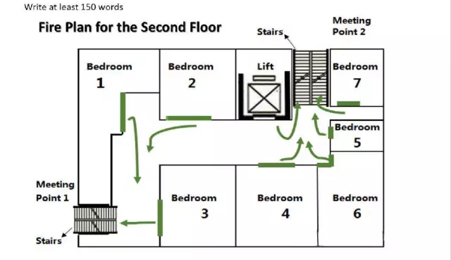 The diagram shows the fire plan for the second floor of a student dorm building in a university. Summarise the information by selecting and reporting the main features and make comparison where relevant.