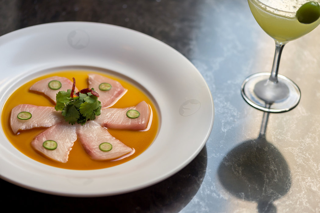 在Nobu下城店,樓上的壽司臺(tái)在雞尾酒吧臺(tái)的另一邊,設(shè)計(jì)公司羅克韋爾集團(tuán)(Rockwell Group)在有凹槽的石灰石柱之間塞進(jìn)了這張吧臺(tái)——大廈一樓有許多這樣的石柱,像是一個(gè)石化了的森林。我剛剛吃了一塊日本扇貝壽司,鋌而走險(xiǎn)搭配了大量山葵,就在這時(shí),一群活躍的新來(lái)者出現(xiàn)在我身邊。壽司師傅警惕地盯著他們,因?yàn)樗麄兯坪醮蛩闳烤墼谝粡埖首又車?,就像人們?huì)在酒吧里做的那樣。但是他們誤以為是酒保的那些人都在忙著切生魚(yú),所以這群人最終離開(kāi)了,繼續(xù)尋找能給他們調(diào)酒的人。