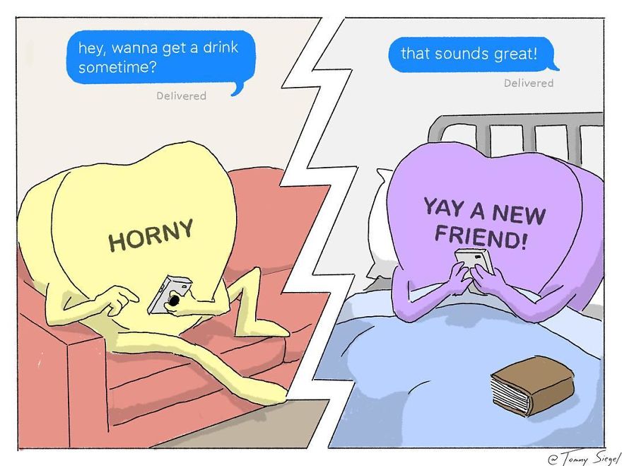 Cartoonist Tommy Siegel draws witty comics featuring candy hearts that resonate very well with people because they show our honest feelings which we might be scared to share with everyone else. A lot of us would probably agree that we’ve had some of these thoughts running through our minds at least once or twice in our lives. Upvote your favorite cartoons, keep scrolling and let us know in the comments what you enjoyed most about the comics.