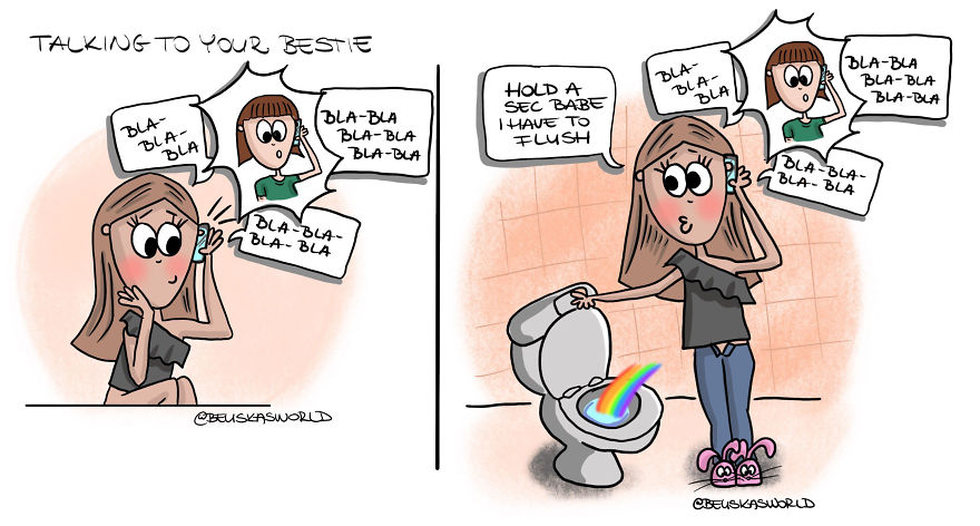 My drawings are based on everyday situations, showing us the happy, funny sides of life and even the little bit annoying ones too. I try to remind everyone to not forget to smile even in weird situations.