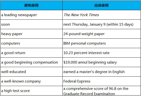 盡量使用明確、具體的詞匯。這樣你的信函將更為專業(yè)、準(zhǔn)確、有趣并且有力。(由于有時(shí)需要使用某種外交手段,可能會(huì)反其道而行之。)